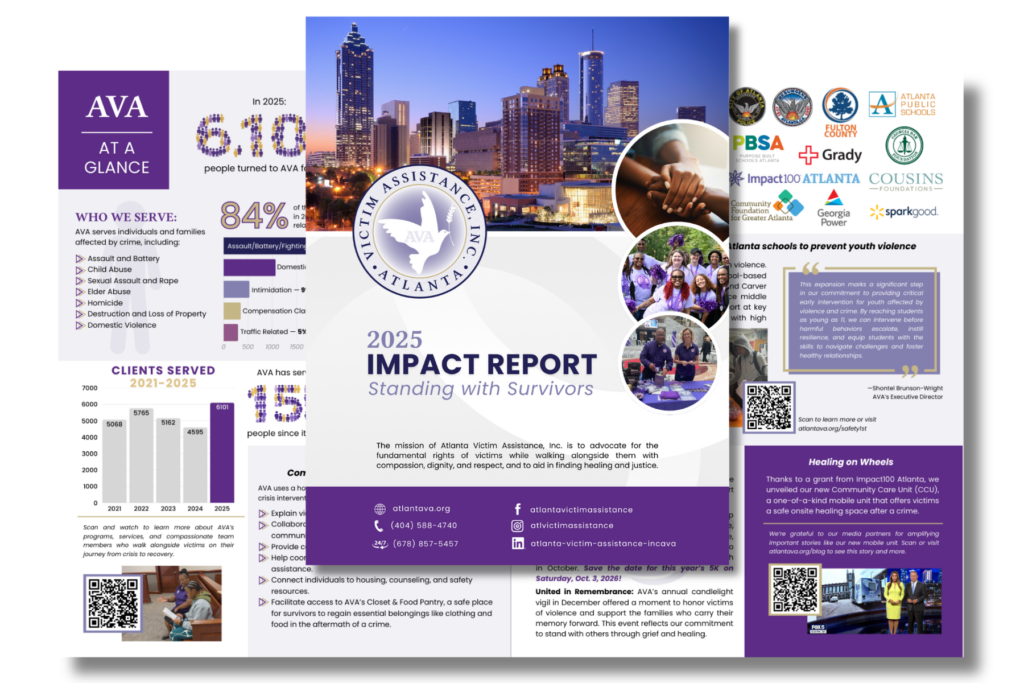 Dear Friends, In 2025, one theme guided everything we did at Atlanta Victim Assistance: standing with survivors. Standing with survivors means being present in moments of crisis and committed for the long road to recovery. It means listening first, responding with compassion, and ensuring that no one has to navigate the aftermath of crime alone.…
